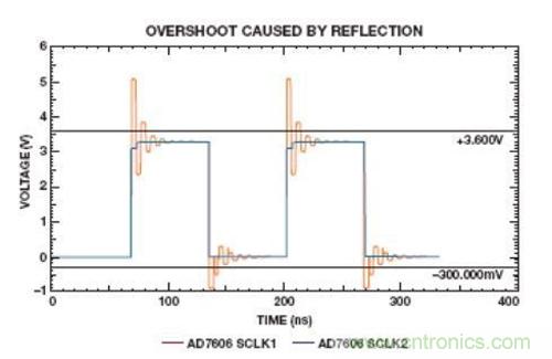 在圖8中,SCLK1上的大過沖違反了–0.3 V至+3.6 V的絕對最大額定值。串聯(lián)電阻可減小SCLK2上的壓擺率,使信號處于額定值之內(nèi)。