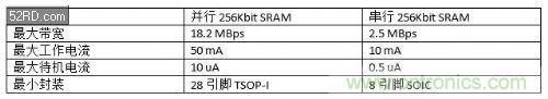 所有這些發(fā)展趨勢都指向一個要求:一個小巧、能夠只扮演緩存的角色、并能使用最小數(shù)量的引腳相連的外置SRAM。串行SRAM就是專為滿足這個要求而量身定做的。存儲器在高速性能并非最重要因素的其它存儲器(DRAM、閃存等)中,串行接口已經(jīng)取代了并行接口。由于存在需要SRAM的應(yīng)用,串行SRAM在SRAM市場中一直處于小眾地位。在空間非常有限的特定應(yīng)用中,它們一直是低功耗、小尺寸替代方案。目前,在峰值時鐘速率為20MHz(10MB/s帶寬)條件下,串行SRAM最大容量為1Mbit。相比之下,并行SRAM的帶寬高達250MB/s,并支持最大64Mbit的容量。下表對比了一個通用型256Kbit并行SRAM和一個256Kbit串行SRAM。