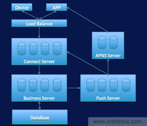 看一下最簡(jiǎn)單的IM架構(gòu),這里面要保持長(zhǎng)連接,接下來(lái)做一些業(yè)務(wù)處理,下面是存儲(chǔ),如果App要去控制Device的時(shí)候,發(fā)到業(yè)務(wù)層處理完了之后,這里面有一個(gè)推送的,可以找到Device到底連了哪一臺(tái)機(jī),然后再把數(shù)據(jù)推送過(guò)來(lái)。如果Device自己的狀態(tài)發(fā)生變化,它的數(shù)據(jù)要推送給APP,基本上是這樣的工作流。如果App是黑莓等設(shè)備的,我們可能要專(zhuān)門(mén)推送到APNS里面來(lái)。