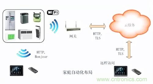 從上圖可看出,家庭自動(dòng)化系統(tǒng)將嵌入式微控制器技術(shù)、無(wú)線連接、接入網(wǎng)絡(luò)融合為一體。Apps軟件能夠使用戶發(fā)現(xiàn)家里的設(shè)備,予以設(shè)置,或者創(chuàng)建一個(gè)動(dòng)作加以控制。
