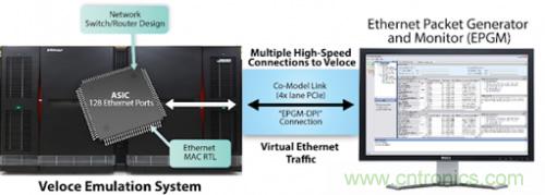 擁有成百上千個端口的設計需要與硬件擁有非常多的連接,而這些連接全都需要接線纜,這就使得在 ICE 環(huán)境中驗證網(wǎng)絡交換機和路由器設計不再可行。此外,一個128 端口的以太網(wǎng)設計等可能具有數(shù)億甚至數(shù)十億個門的尺寸。