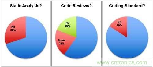 接著讓我們繼續(xù)更深入一點(diǎn)探討:要符合產(chǎn)業(yè)安全性標(biāo)準(zhǔn),可能耗費(fèi)大量成本與時(shí)間,那么要實(shí)現(xiàn)一個(gè)優(yōu)良設(shè)計(jì)的其他最佳實(shí)作呢?例如在軟體設(shè)計(jì)上使用編碼標(biāo)準(zhǔn)、程式碼審查以及統(tǒng)計(jì)分析?在這個(gè)技術(shù)領(lǐng)域從事攸關(guān)安全裝置設(shè)計(jì)的工程師受訪者們的回應(yīng)更令人擔(dān)心了,請(qǐng)看下圖的統(tǒng)計(jì):