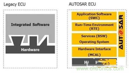 就本質(zhì)而言,AUTOSAR提供標準的ECU接口定義,使設(shè)計人員能夠具體指定每個汽車ECU中都需要的可重復(fù)使用之標準化軟件層和組件。該標準不受硬件的影響,這意味著應(yīng)用軟件和硬件平臺是相互獨立的。應(yīng)用軟件開發(fā)人員可在應(yīng)用軟件中明確地說明各個汽車功能的細節(jié),而不用擔心相關(guān)軟件服務(wù)和硬件接口。過去,軟件和硬件緊密地整合在一起,因此很難實現(xiàn)可移植性和可重復(fù)使用(圖1)。