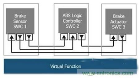 將設(shè)計與硬件決策分開使車輛生產(chǎn)商/OEM能夠依據(jù)所需的車輛功能進行自上而下的設(shè)計。存在于這個設(shè)計時間的虛擬功能總線(VFB)概念讓所有軟件電子控制單元都能夠?qū)崿F(xiàn)互連和獲得測試。這讓設(shè)計人員可專注于應(yīng)用層,而不是根本的軟件基礎(chǔ)建設(shè)。通過采用虛擬功能總線,應(yīng)用軟件組件(SWC)與其它應(yīng)用軟件組件也相互獨立。軟件組件向虛擬功能總線發(fā)出輸出信號,虛擬功能總線再將信息傳送給目標組件的輸入埠。AUTOSAR定義了輸入和輸出端口,以及交換信息的格式。這種抽離式的(abstracted)方法使得在定義相關(guān)硬件之前可實現(xiàn)所有車輛軟件功能和接口交互驗證。設(shè)計調(diào)整也因此變得容易得多,同時所有功能都被定義成虛擬功能總線上的軟件組件(圖2)。