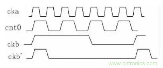 為了方便討論,時(shí)鐘樹(shù)插入以后,假設(shè)A與B之間有1個(gè)ckaCycle的skew;從圖3可以看到如果采用A點(diǎn)作加法器的輸入時(shí)產(chǎn)生的波形是ckb’,采用B點(diǎn)作為輸入時(shí)的波形是ckb,顯然,從例1的代碼來(lái)看,ckb才是正確的。因此必須注意到,如果時(shí)鐘當(dāng)作普通的信號(hào)使用時(shí)可能帶來(lái)的問(wèn)題,這類問(wèn)題并沒(méi)有一個(gè)通用的解決辦法。在這個(gè)例子中,不采用時(shí)鐘樹(shù)上的信號(hào)才是正確的,但是在另外一些應(yīng)用中,就必須采用時(shí)鐘樹(shù)上的信號(hào)。比如,時(shí)鐘是CK的兩個(gè)觸發(fā)器中鎖存的數(shù)據(jù)再由CK的高電平和低電平選擇輸出,那么,這個(gè)時(shí)候就需要作為選擇信號(hào)的CK從時(shí)鐘樹(shù)上拉過(guò)來(lái)。因此,如果設(shè)計(jì)中用到了時(shí)鐘信號(hào)作為普通信號(hào)的情況,在后端設(shè)計(jì)時(shí)就必須特殊處理。