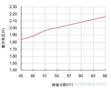 在負(fù)載電阻由45Ω不斷增大到66Ω時,節(jié)點的輸出差分電壓也隨著由1.84V增大到2.16V,兩者近似線性關(guān)系。為了使發(fā)送節(jié)點的輸出差分電壓不至于過低,實際組網(wǎng)時負(fù)載電阻應(yīng)在圖 1測試的范圍內(nèi)波動。我們分析RL的組成有3個:終端電阻、總線節(jié)點的差分輸入電阻、總線本身的有效電阻。