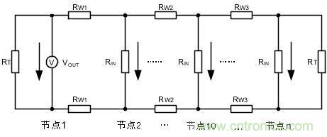 圖 4中,各節(jié)點的RW、RIN難以準(zhǔn)確確定,組網(wǎng)時以公式計算較為繁瑣,簡便的方法便是測量總線兩端的節(jié)點電壓。如網(wǎng)絡(luò)的總線電阻過大時,節(jié)點1到節(jié)點n總線對信號的損耗會很大,當(dāng)節(jié)點n接收的差分電壓低于1.2V時,需要增大終端電阻。