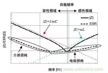 低頻率范圍:低頻率范圍的|Z|與理想電容器相同,都與頻率呈反比趨勢減少。ESR值也顯示出與電介質分極延遲產(chǎn)生的介質損耗相應的特性。