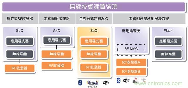 · 全整合式無線SoC:這是一種單芯片的單一建置方案,適用于特定的無線技術(shù),尤其是用于物聯(lián)網(wǎng)應用的低功耗藍牙技術(shù)。鏈路層和PHY整合于SoC中,以執(zhí)行所有的軟件堆棧和應用程序代碼。