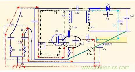 它的作用是雙重的,一是為Mosfet動(dòng)作產(chǎn)生且串到變壓器副邊的noise 電流(如I4),提供一個(gè)低阻抗的回路,減小到地的電流。二是為二次側(cè)Diode產(chǎn)生的且串到變壓器原邊的noise 電流提供低阻抗回路,從而減小流過(guò)LISN的電流。