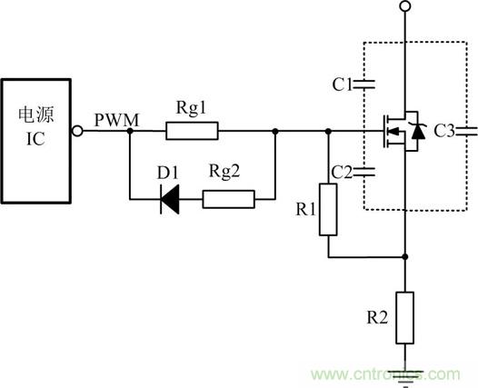 關(guān)斷瞬間驅(qū)動(dòng)電路能提供一個(gè)盡可能低阻抗的通路供MOSFET柵源極間電容電壓快速泄放,保證開關(guān)管能快速關(guān)斷。為使柵源極間電容電壓的快速泄放,常在驅(qū)動(dòng)電阻上并聯(lián)一個(gè)電阻和一個(gè)二極管,如圖3所示,其中D1常用的是快恢復(fù)二極管。這使關(guān)斷時(shí)間減小,同時(shí)減小關(guān)斷時(shí)的損耗。Rg2是防止關(guān)斷的時(shí)電流過大,把電源IC給燒掉。