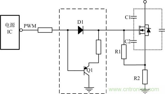 如果選擇MOS管寄生電容比較大,電源IC內(nèi)部的驅(qū)動(dòng)能力又不足時(shí),需要在驅(qū)動(dòng)電路上增強(qiáng)驅(qū)動(dòng)能力,常使用圖騰柱電路增加電源IC驅(qū)動(dòng)能力,其電路如圖 2虛線框所示。