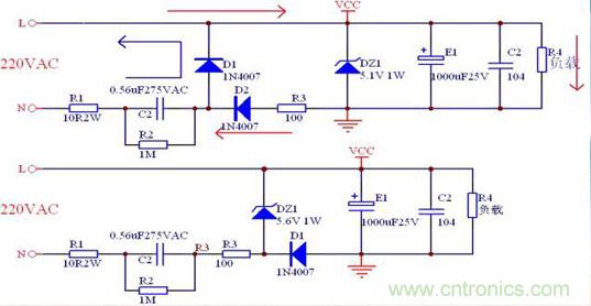 阻容降壓電路可以等效為由降壓電容C1和負(fù)載電阻R1組成,電阻和電容串聯(lián)分壓。