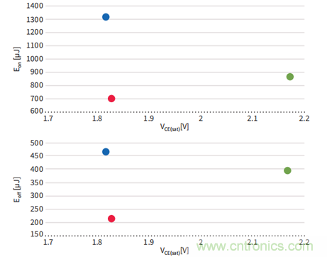 600/650V IGBT 飽和壓降(VCE(sat) ) vs開通損耗(Eon ) & 關(guān)斷損耗(Eoff)比較測試條件: TC = 150°C, IC = 15 A, Rg = 25, VGE = 15 V。