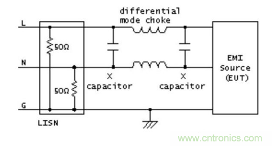 電容的作用是將高頻干擾電壓“短路”,另外,當(dāng)干擾信號頻率很高時,抑制線圈將產(chǎn)生很大的交流阻抗。圖2顯示了兩種濾波類型的結(jié)構(gòu),其中,LISN是用于測量目的的線性阻抗穩(wěn)定網(wǎng)絡(luò)。如果是共模問題引起的干擾,X類型電容基本上沒有作用,因為兩線上的干擾電壓是一樣的。因此,了解干擾類型對于選擇合理的電路結(jié)構(gòu)將起重要作用,并為解決問題提供技術(shù)依據(jù)。