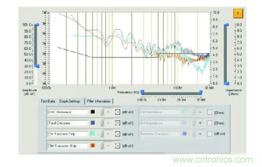 在標準電磁兼容性測試實驗室可得到設(shè)備的總干擾情況,但無法了解設(shè)備的共模干擾和差模干擾特性。為了在測量中分辨共?;蛘卟钅8蓴_信號,通用的儀器是很難實現(xiàn)的。使用專用的傳導(dǎo)測試儀,可獲得設(shè)備的總干擾、共模干擾和差模干擾。測試結(jié)果如圖3所示。