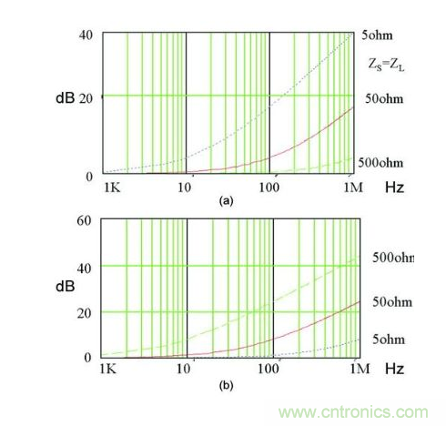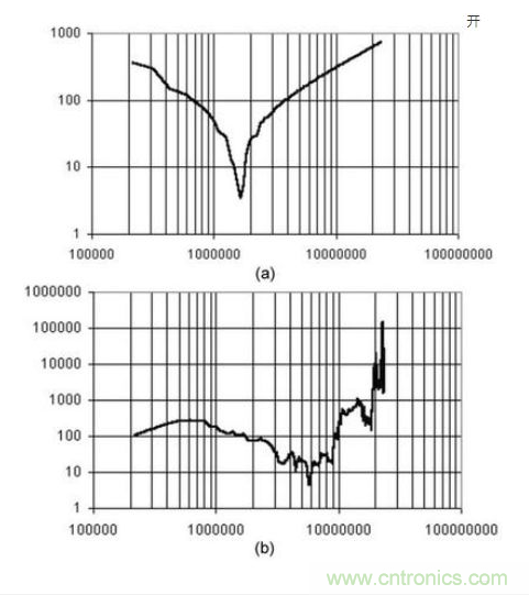 上面的例子說明,選擇一個具有很高插損的濾波器也不能很好抑制傳導(dǎo)噪聲的原因是,電源輸入端阻抗的影響。因此,設(shè)計者除了選擇一個合適的濾波器之外,還需要了解電源的阻抗特性、共模阻抗和差模阻抗。阻抗測試可以借助專用的阻抗測試儀或者傳導(dǎo)分析儀。一種濾波器的共模阻抗(a)和差模阻抗(b)的變化如圖5所示。