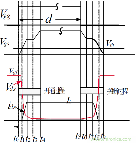 -- [t0-t1]區(qū)間,MOSFET 的GS 電壓經(jīng)Vgg 對(duì)Cgs充電而上升,在t1時(shí)刻,到達(dá)維持電壓Vth,MOSFET 開(kāi)始導(dǎo)電;