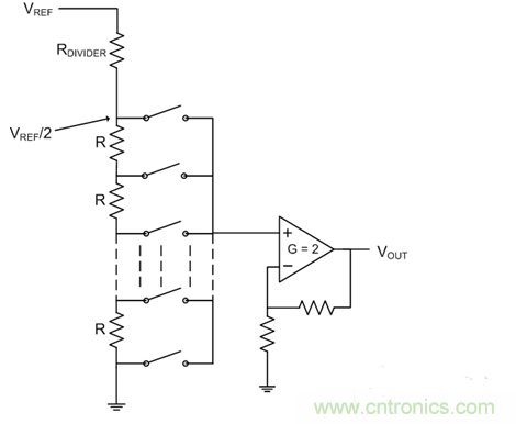電阻串 DAC 設(shè)計(jì)最終、最微妙的元件是位于串電阻器及接點(diǎn)之前的分壓器。該電阻器電阻等于串中其余電阻器的等效阻抗,能有效將參考輸入減半。這樣做的目的是降低輸出緩沖器的共模輸入要求,并在實(shí)現(xiàn)良好性能的同時(shí)幫助保持低成本。為了對(duì)此進(jìn)行補(bǔ)償,輸出緩沖器一般采取 2 倍的非反相增益,盡管有時(shí)反饋電阻器通過(guò)數(shù)字控制實(shí)現(xiàn)不同增益。