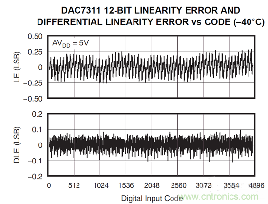 每個(gè)電阻器值的精確度可直接決定線性度。如果電阻串中任何一個(gè)電阻器的值不合適,我們就會(huì)在代碼轉(zhuǎn)換時(shí)發(fā)現(xiàn)相對(duì)于該電阻器的不良微分非線性度 (DNL)。此外,所有后續(xù)代碼的積分非線性度 (INL) 也會(huì)因?yàn)椴黄ヅ涠a(chǎn)生失調(diào)。由于典型電阻串 DAC 設(shè)計(jì)中的電阻器數(shù)量龐大,我們不可能對(duì)每個(gè)電阻器都進(jìn)行調(diào)整,因此只能接受一定程度上的 DNL 誤差。然而,仍然必須維持良好的 INL 性能,因此可經(jīng)常對(duì)各組電阻器實(shí)施區(qū)域化調(diào)整,以避免調(diào)整每個(gè)電阻器,其在以下 INL 圖中呈“階梯”狀。
