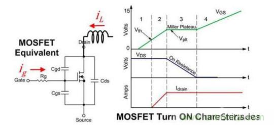 這里就用MOSFET代替BJT了,所以ids = ic,Vds=Vce,Coss也就是Cds代表輸出電容。簡單來說就是當(dāng)MOS管一開始導(dǎo)通時輸出電容Coss還保持Vds電壓,隨著Ids電流越來越大,Vds電壓終于保持不住,開始下降。直到管子完全開啟。比較詳細(xì)的開啟過程是由Miller Plateau造成的,這里借用了網(wǎng)上一些解釋Miller Plateau的圖,如果有不清楚的就請見諒了。