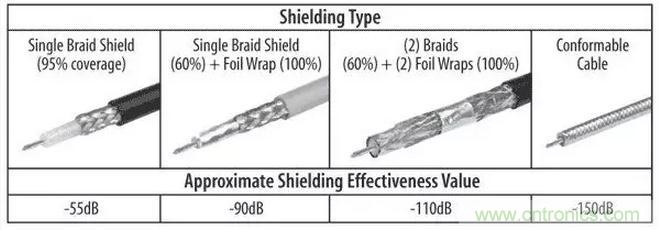 圖4:同軸電纜屏蔽可以用編織物、箔片或組合實現(xiàn),以產(chǎn)生與電纜頻率不同的衰減規(guī)格。
