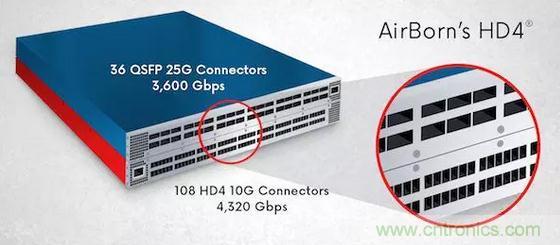 圖12:針對高密度設(shè)計的AirBorn 10GHD4®連接器可在同一托架系統(tǒng)內(nèi)提供比25G QSFP連接器更高的吞吐量,從而實現(xiàn)組件和能源成本節(jié)省。