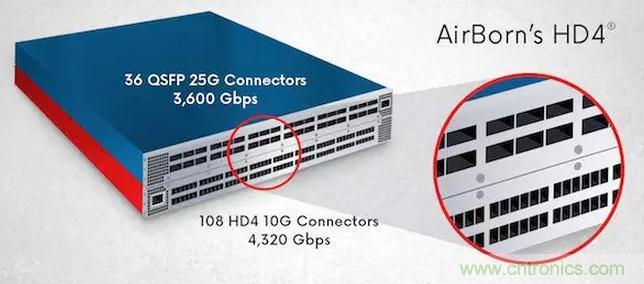 圖2:針對高密度設(shè)計(jì)的AirBorn 10GHD4®連接器可在同一托架系統(tǒng)內(nèi)提供比25G QSFP連接器更高的吞吐量,從而實(shí)現(xiàn)組件和能源成本節(jié)省。