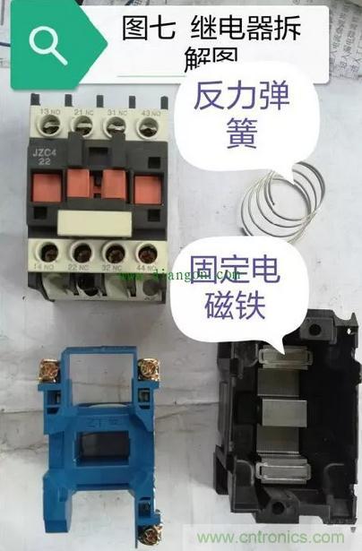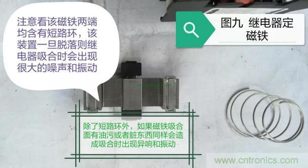 接下來(lái)我們?cè)賮?lái)看一下繼電器內(nèi)部吸合部分的構(gòu)造,在這部分當(dāng)中以固定吸合磁鐵上短路環(huán)所引發(fā)的故障最為常見(jiàn),詳情請(qǐng)看圖七至圖九的展示: