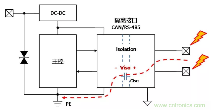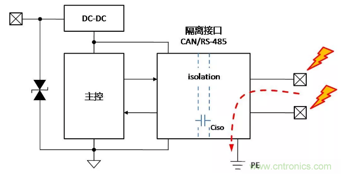 假設(shè)控制側(cè)均做了足夠的保護(hù)措施,當(dāng)控制側(cè)接口受到靜電放電時(shí),能量通過控制側(cè)保護(hù)器泄放至PE,對(duì)隔離通信接口基本無影響,如下面圖2。