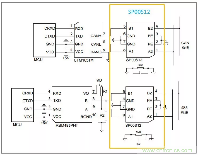 前面只是對(duì)ESD的作用機(jī)理進(jìn)行了分析,但隨著工業(yè)產(chǎn)品對(duì)通信接口的EMC等級(jí)要求越來越高。許多應(yīng)用要求滿足IEC61000-4-2靜電放電4級(jí),IEC61000-4-5浪涌抗擾4級(jí)要求。一般的收發(fā)器ESD、浪涌的防護(hù)等級(jí)均比較低,如CTM1051M隔離CAN收發(fā)器的隔離耐壓為2500VDC,裸機(jī)情況下,ESD、浪涌等級(jí)均較低。所以有必要增加外圍電路,提高通信端口的EMC等級(jí)。