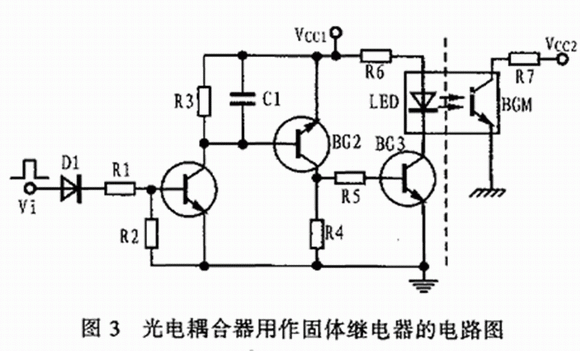 采用光電耦合器作固體繼電器具有體積小、耦合密切、驅(qū)動功率小、動作速度快、工作溫度范圍寬等優(yōu)點(diǎn)。圖3所示是一個光電耦合器用作固體繼電器的實(shí)際電路圖,它的左半部分電路可用于將輸入的電信號Vi變成光電耦合器內(nèi)發(fā)光二極管發(fā)光的光信號;而右半部分電路則通過光電耦合器內(nèi)的光敏三極管再將光信號還原成電信號,所以這是一種非常好的電光與光電聯(lián)合轉(zhuǎn)換器件。圖中所用的光電耦合器的電流傳輸比為20%,耐壓為150V,驅(qū)動電流在8~20mA之間。在實(shí)際使用中,由于它沒有一般電磁繼電器常見的實(shí)際接點(diǎn),因此不存在接觸不良和燃弧打火等現(xiàn)象,也不會因受外力或機(jī)械沖擊而引起誤動作。所以,它的性能比較可靠,工作十分穩(wěn)定。