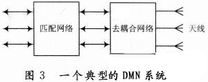 為了提高天線的輻射效率,學(xué)者們提出了DMN技術(shù),即在多個天線的輸入端先加耦合器以去掉天線之間的耦合,然后加匹配網(wǎng)絡(luò),如圖3所示。文獻對這種方法進行了詳細論述,并闡述了用S參數(shù)分析正交模的方法。下面對一個二端口網(wǎng)絡(luò)的天線進行S參數(shù)的分析。