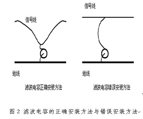 電容的諧振頻率由ESL和C共同決定,電容值或電感值越大,則諧振頻率越低,也就是電容的高頻濾波效果越差。ESL除了與電容器的種類有關(guān)外,電容的引線長度是一個(gè)十分重要的參數(shù),引線越長,則電感越大,電容的諧振頻率越低。因此在實(shí)際工程中,要使電容器的引線盡量短,電容器的正確安裝方法和不正確安裝方法如圖2所示。