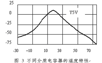 由于電容器中的介質(zhì)參數(shù)受到溫度變化的影響,因此電容器的電容值也隨著溫度變化。不同的介質(zhì)隨著溫度變化的規(guī)律不同,有些電容器的容量當(dāng)溫度升高時(shí)會減小70%以上,常用的濾波電容為瓷介質(zhì)電容,瓷介質(zhì)電容器有超穩(wěn)定型:COG或NPO,穩(wěn)定型:X7R,和通用型:Y5V或Z5U三種。不同介質(zhì)的電容器的溫度特性如圖2所示。