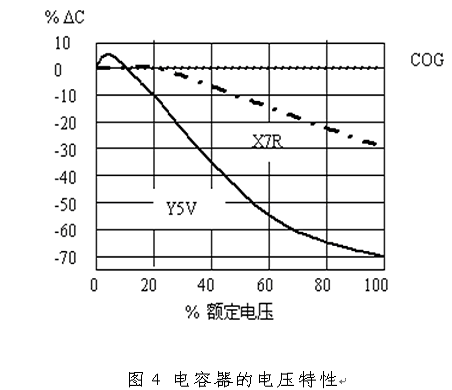 電容器的電容量不僅隨著溫度變化,還會隨著工作電壓變化,這一點(diǎn)在實(shí)際工程必須注意。不同介質(zhì)材料的電容器的電壓特性如圖3所示。從圖中可以看出,X7R電容器在額定電壓狀態(tài)下,其容量降為原始值的70%,而Y5V電容器的容量降為原始值的30%!了解了這個(gè)特性,在選用電容時(shí)要在電壓或電容量上留出余量,否則在額定工作電壓狀態(tài)下,濾波器會達(dá)不到預(yù)期的效果。