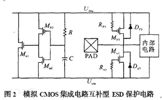 數(shù)字電路一般采用兩級保護電路,并且在主保護電路和次保護電路中串聯(lián)一個限流電阻,而大的限流電阻和ESD 鉗位器件的節(jié)電容會產(chǎn)生一個大的RC 延遲,因此,不適合應(yīng)用于高速模擬CMOS集成電路中。