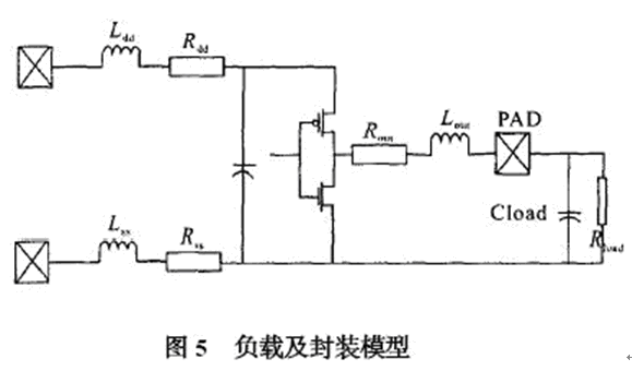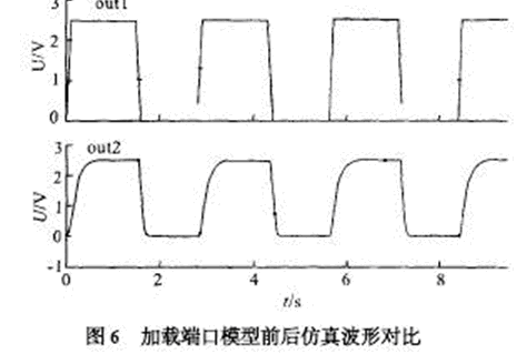 由于ESD 保護電路以及封裝所帶來的寄生電容和寄生電感對原有輸出信號會有影響,尤其是在高速模擬電路中,頻率越高信號畸變越嚴重,所以建立合適的仿真模型并進行有效的仿真是必須的。信號一般經(jīng)過驅(qū)動, ESD 保護,和封裝引線才能傳到芯片外的負載上,封裝的模型根據(jù)選用的封裝形式和廠家提供的參數(shù)決定。 一般IC 封裝會給出端口的寄生電容,電阻和電感,其等效模型如圖5所示。 將該模型與前面的ESD 保護電路(圖3) 串連起來就可以得到端口模型, 可用spice 對用于USB2.0 的環(huán)境,在480 MHz 頻率下的收發(fā)電路進行仿真,其仿真波形如圖6 所示。 輸出端口out1 是不考慮端口模型的影響,480 MHz 時鐘的輸出較為理想,out2 是加入端口模型后的時鐘輸出,波形有所畸變,但仍能滿足電路設(shè)計要求。