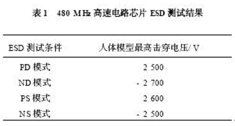 上述ESD 保護電路(見圖3) 在被應(yīng)用于設(shè)計USB2. 0 接口芯片中。 該芯片的最高時鐘頻率為480 MHz ,采用TSMC 公司的0. 25μm 混合信號工藝進行了流片。 流片后的芯片用抗靜電測試儀( Thermo Keytek 公司,型號: ZAPMASTER 714)進行了測試,其結(jié)果如表1 所示,給出了在上述4 種不同的放電模式下的耐壓值。 測試結(jié)果表明在所有測試條件下的人體模型最高擊穿電壓(V) 超過了正負2 500 V。