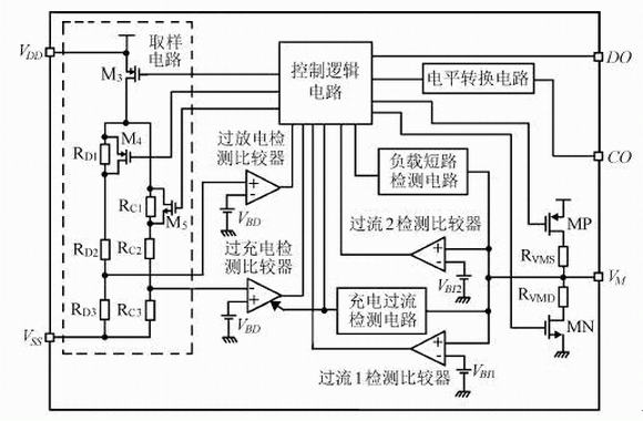 鋰離子電池保護(hù)電路為了實(shí)現(xiàn)其基本功能,首先需要檢測(cè)異?,F(xiàn)象。過(guò)充電和過(guò)放電檢測(cè)是將電池電壓進(jìn)行分壓(采樣)后與基準(zhǔn)電壓比較實(shí)現(xiàn)的;而對(duì)于過(guò)流檢測(cè),保護(hù)芯片首先將充放電過(guò)程中的電流轉(zhuǎn)化為在功率管FET1、FET2上的電壓,然后通過(guò)VM與基準(zhǔn)電壓比較完成,放電過(guò)流檢測(cè)的是正電壓,充電過(guò)流檢測(cè)的是負(fù)電壓。
