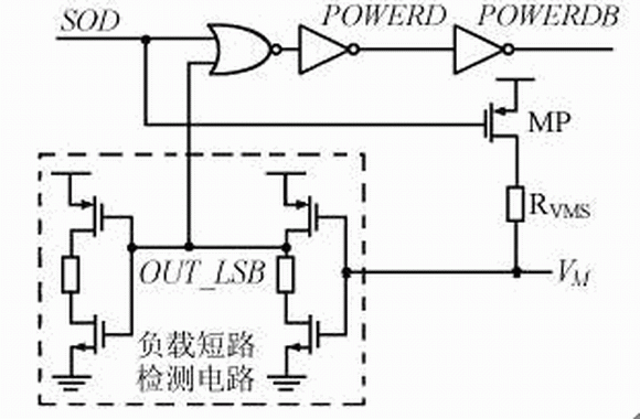 圖4 中SOD為過(guò)放電檢測(cè)信號(hào),系統(tǒng)處于正常狀態(tài)時(shí),SOD為高電平,VM為低電平,因此待機(jī)狀態(tài)控制信號(hào)POWERD輸出高電平、POWERDB輸出低電平。當(dāng)系統(tǒng)進(jìn)入過(guò)放電狀態(tài)時(shí),SOD(延時(shí)后的信號(hào))變?yōu)榈碗娖剑琈P導(dǎo)通使VM變?yōu)楦唠娖?,最終使POWERD變?yōu)榈碗娖?、POWERDB變?yōu)楦唠娖?,它們控制保護(hù)電路相應(yīng)模塊停止工作,系統(tǒng)進(jìn)入待機(jī)狀態(tài)。當(dāng)對(duì)電池進(jìn)行充電時(shí),由圖1可知VM被強(qiáng)制拉到低電平,使負(fù)載短路檢測(cè)電路的輸出信號(hào)OUT_LSB變?yōu)楦唠娖?;此時(shí),不論SOD為何值或非門(mén)都將輸出低電平,POWERD由此變?yōu)楦唠娖?,這樣,就可實(shí)現(xiàn)待機(jī)狀態(tài)的退出。