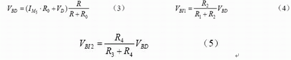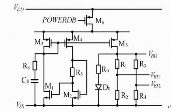 電路的工作原理為:由M1—M4和R5組成的自偏置電路產(chǎn)生具有正溫度系數(shù)的電流,它在電阻R0所產(chǎn)生的壓降和具有負(fù)溫度系數(shù)的PN 結(jié)壓降(D0上的壓降)相加,從而輸出零溫度系數(shù)的基準(zhǔn)電壓VBD;為滿足同一電路中輸出不同的基準(zhǔn)電壓源,利用電阻分壓將VBD 分成了VBI1及VBI2輸出;C0和R6組成啟動(dòng)電路。