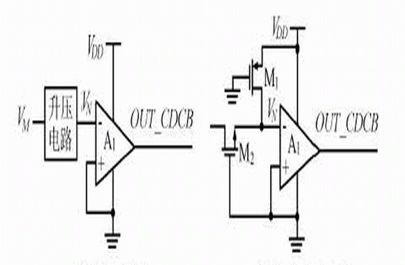 充電過(guò)流的檢測(cè)歸結(jié)為檢測(cè)VM電壓,其臨界值為VCH(約為-1.3V)。如果所用工藝的MOS管閾值電壓可以調(diào)節(jié),負(fù)電壓檢測(cè)電路可用差分結(jié)構(gòu)的比較器實(shí)現(xiàn),其中比較器的一個(gè)輸入端接地,并且兩個(gè)差分對(duì)管的閾值電壓需要調(diào)整。為了使該電路能用常規(guī)的CMOS 工藝實(shí)現(xiàn),本文在過(guò)零比較器的基礎(chǔ)上引入升壓電路,如圖6(a)所示當(dāng)VM》VCHA時(shí),升壓電路使VN>0 。升壓部分具體實(shí)現(xiàn)如圖6(b)所示。