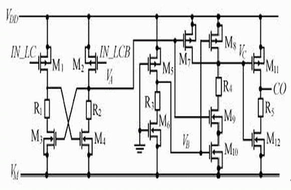 在正常的放電過(guò)程中,VM端電位大于零而接近于零,可近似為VSS。此時(shí),該電路的輸入信號(hào)IN_LCB=‘0’,IN_LC=‘1’,顯然,CO輸出為高電平(VDD)。