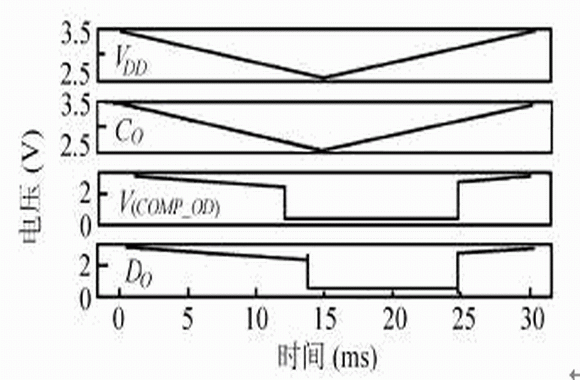 芯片的所有功能和主要參數(shù)均用HSPICE 進(jìn)行了模擬驗(yàn)證。圖8 給出了過(guò)充電保護(hù)檢測(cè)和釋放波形圖,圖9 給出了過(guò)放電保護(hù)檢測(cè)和釋放波形圖,其中COMP_OC 為過(guò)充電比較器的輸出信號(hào),COMP_OD 為過(guò)放電比較器的輸出信號(hào);芯片的過(guò)充電和過(guò)放電檢測(cè)精度約為30mV,在正常工作時(shí)消耗的電流為3.23uA,在待機(jī)狀態(tài)時(shí)消耗的電流為0.15uA。