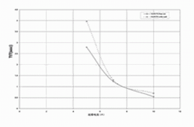 圖4顯示使用帶狀接腳(它們可能用在電池盒中),降低溫度轉(zhuǎn)換系數(shù)的結(jié)果。比較指出,帶狀接腳能在故障電流接近組件特定動(dòng)作電流時(shí),降低TtT,但此結(jié)果在較高電流時(shí)并不存在。