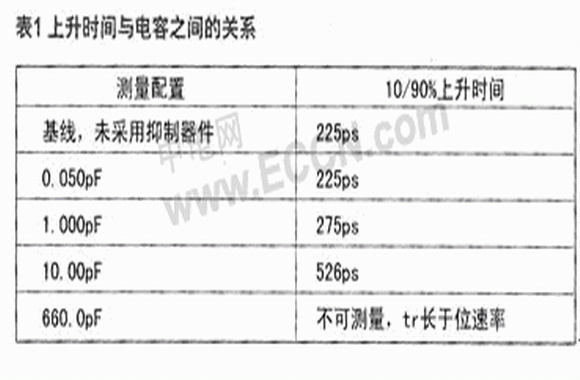 通常,USB 2.0支持480Mbps(bits per second)的數(shù)據(jù)傳輸;DVI和HDMI協(xié)議更是分別支持高達8Gbps和5Gbps的數(shù)據(jù)傳輸帶寬。在USB2.0、DVI和HDMI的高速數(shù)據(jù)率下,傳統(tǒng)保護裝置的寄生電容可能破壞信號的完整性或令其失真。失真表現(xiàn)為由較慢的上升和下降時間所致的高態(tài)/低態(tài)瞬變的前沿和后沿被修圓。上升和下降時間較慢會給系統(tǒng)帶來一些問題,其中最重要的是時序問題。電路在特定的時間需要穩(wěn)定的"高"態(tài)和"低"態(tài)。隨著各狀態(tài)之間過渡時間的增加,電路有可能檢測到不完整的過渡期,從而將數(shù)據(jù)誤差引入系統(tǒng)。附表1是不同寄生電容ESD抑制器件對數(shù)據(jù)上升沿時間(10%至90%高電平)所造成的影響比較。
