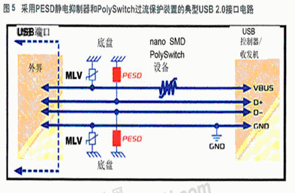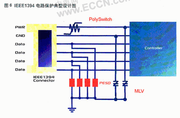 圖4、圖5和圖6展示了利用瑞侃電路保護部門PESD器件對HDMI1.3、USB2.0和IEEE1394接口電路進行保護的典型應用。這些保護將ESD與敏感電路隔離。在傳輸線路脈沖(TLP) 測試和IEC61000-4-2測試中,尤其是經(jīng)過多次采樣(1000次TLP測試)后,其性能要比其他可比較的元件好。相對于其他典型的聚合物ESD防護器件,這類PESD器件的較低觸發(fā)電壓(通常150V)和低箝位電壓(通常25V)能更好的幫助保護敏感電子元件。該器件采用電子工業(yè)中最流行的0603和0402貼裝形式,符合RoHS的嚴格要求;幫助機頂盒敏感電路、手提電腦、手機和其它便攜式設備免ESD侵害。
