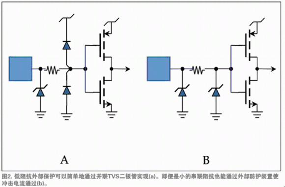 設(shè)計(jì)時(shí),可以保護(hù)簡(jiǎn)單低速的單端輸入/輸出(I/O)線,開(kāi)發(fā)利用類似于IC制造商使用的拓?fù)浣Y(jié)構(gòu)。實(shí)際上,如果選擇了更有效的抑制器,并且將其放置在離瞬態(tài)切入點(diǎn)盡可能近的位置,產(chǎn)品的瞬態(tài)承受能力將會(huì)大大地提高。如果輸入/輸出線需要低阻抗回路,可以簡(jiǎn)單地使單一的TVS二極管鄰近信號(hào)的外部連接器(圖2a)。這個(gè)處理方法會(huì)使外部和芯片上的二極管共享電流。
