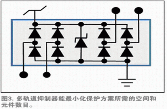如果產(chǎn)品要在輸入/輸出線中承受某些額外阻抗(如在單端邏輯輸入時(shí)經(jīng)常出現(xiàn)的情況),可以通過(guò)在外部夾鉗和IC引腳之間增加一個(gè)電阻器,使外部和芯片上二極管之間的電流有助于外部防護(hù)(圖2b)。一些TVS二極管供應(yīng)商在單一小型組件包里提供兩個(gè)結(jié)型二極管和一個(gè)TVS夾鉗,進(jìn)一步減少組件數(shù)目、降低裝配成本,避免互連偏離。這些組件包同樣適用于多軌道情況——單一的組件包為幾條普通供電軌提供保護(hù)(圖3)。